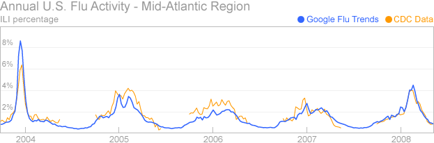 Google has identified correlations (very tight correlations) between certain search terms and actual flu activity. It’s an interesting use of the data – and it’s curious to consider what else correlates – good Wisdom of Crowds example.