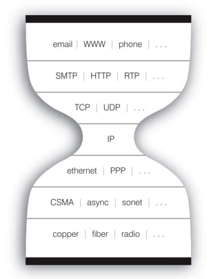 It’s the classic internet hourglass with signal carriers down the bottom, IP in the middle and applications up top. You can see the World Wide Web perched atop HTTP, one more technical layer in a technical layer cake.